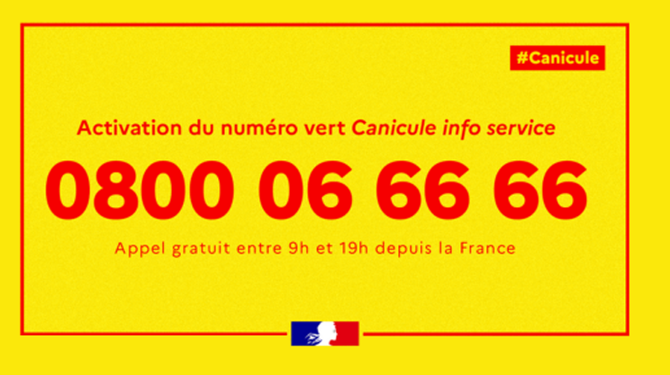 Le ministère du Travail, de la Santé, des Solidarités et des Familles vous informe de l'ouverture du numéro vert 0 800 06 66 66 jusqu’à la fin de l’épisode de canicule de 8h à 19h (appel gratuit depuis la France métropolitaine).