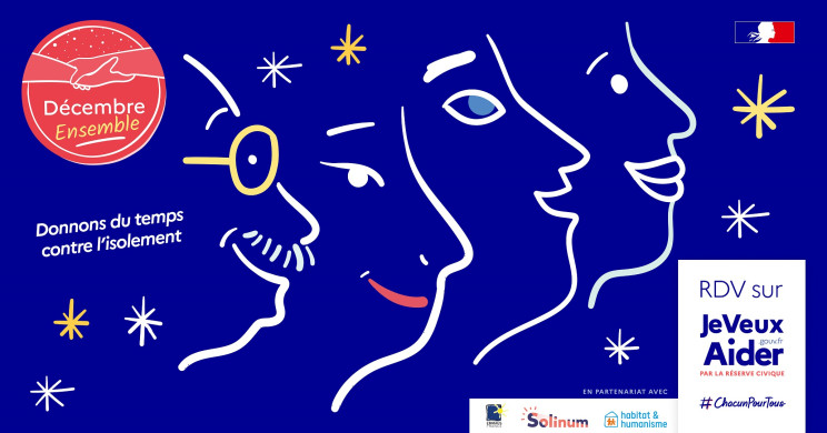 Décembre Ensemble est une campagne de mobilisation à l’initiative de JeVeuxAider.gouv.fr et en partenariat avec Emmaüs France, Solinum et Habitat et humanisme en direction des personnes les plus isolées.