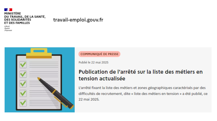 La rédaction de travail-emploi.gouv.fr, site du ministère du Travail, de la Santé, des Solidarités et des Familles vous informe que l’arrêté fixant la liste des métiers et zones géographiques caractérisés par des difficultés de recrutement, dite « liste des métiers en tension » vient d'être publié.