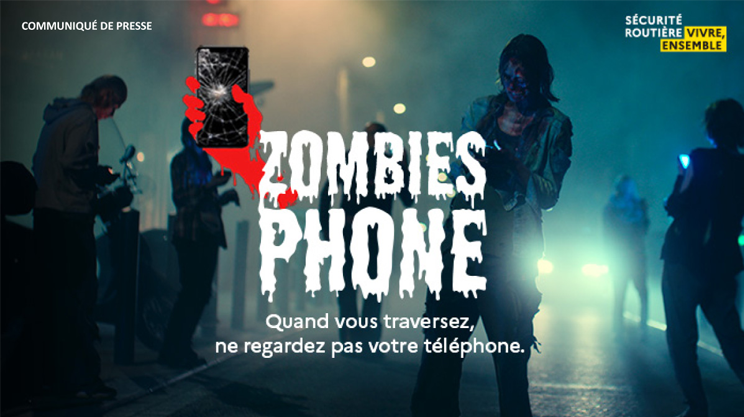 Les Zombies phone désignent certains piétons aux trajectoires erratiques qui soudainement traversent sans regarder autour d'eux ; ainsi en clin d'œil à la soirée d' Halloween du 31 octobre - la Sécurité routière met donc en garde les accros du smartphone sur les risques associés lors de leurs déplacements.
